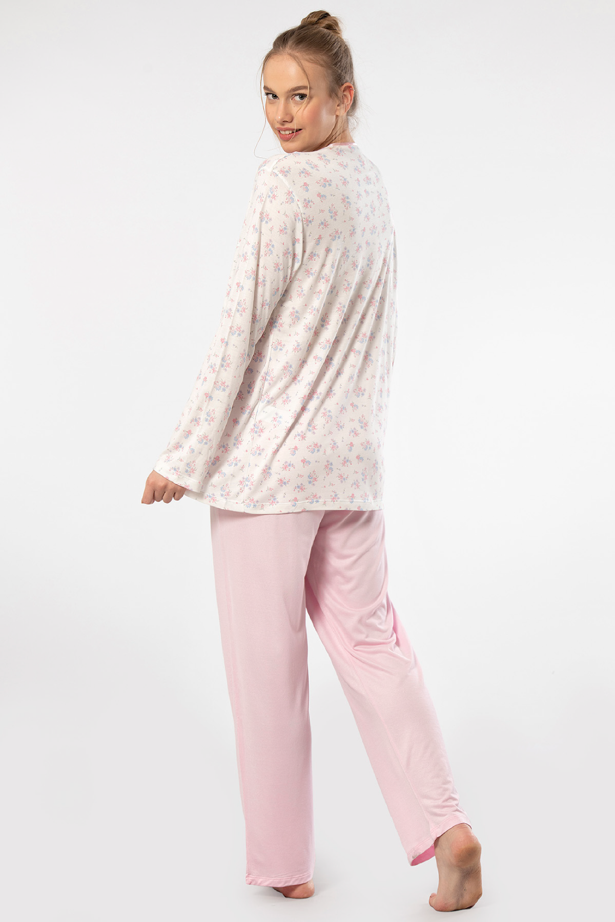 Çiçek desenli empirme patlı battal uzun kollu anne pijaması. %65 viskon karışımı kumaşıyla cildi