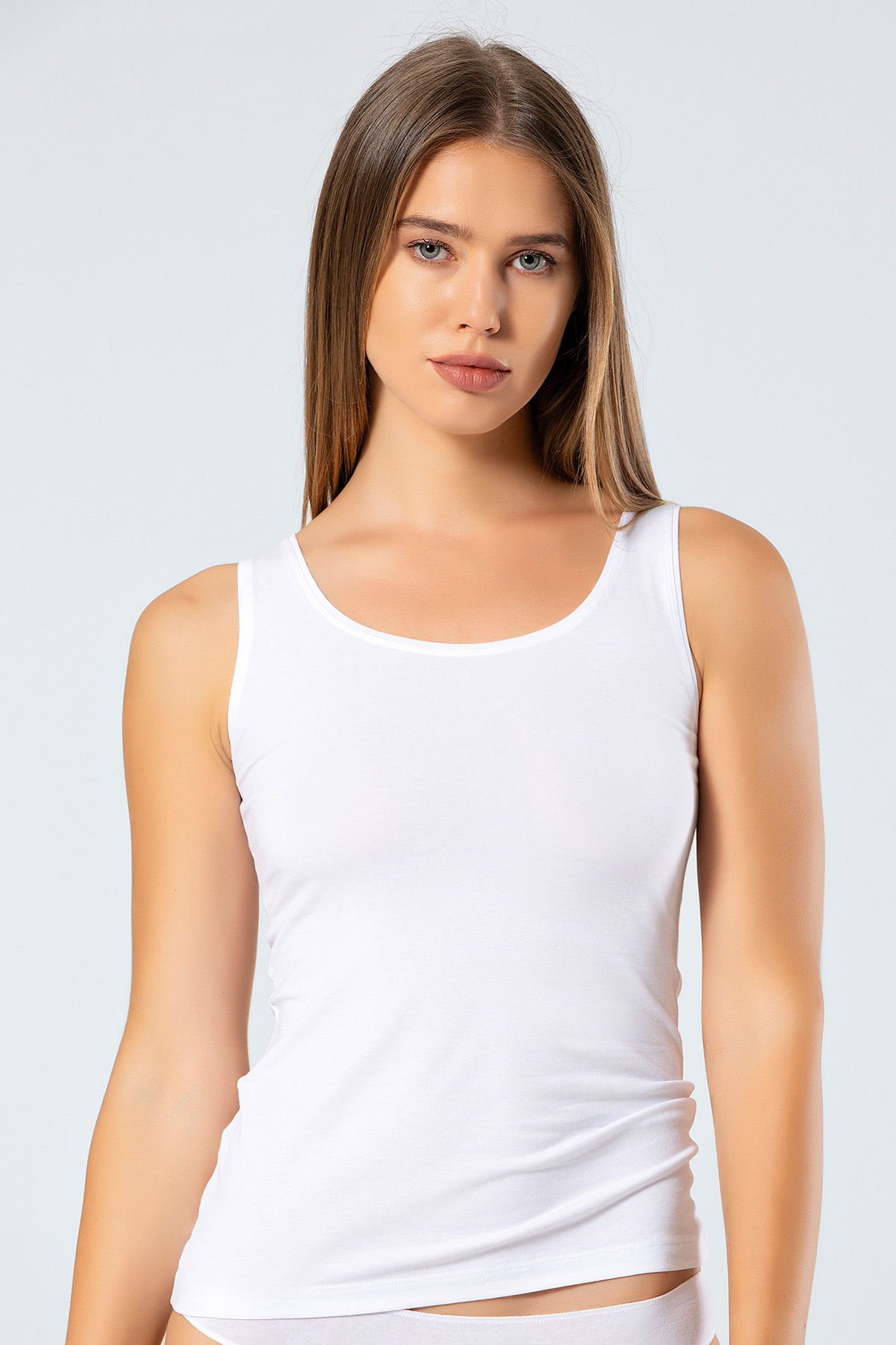 Likralı pamuklu kumaşıyla her vücut formuna uyum sağlayan geniş yaka, slim fit atlet. Elastan