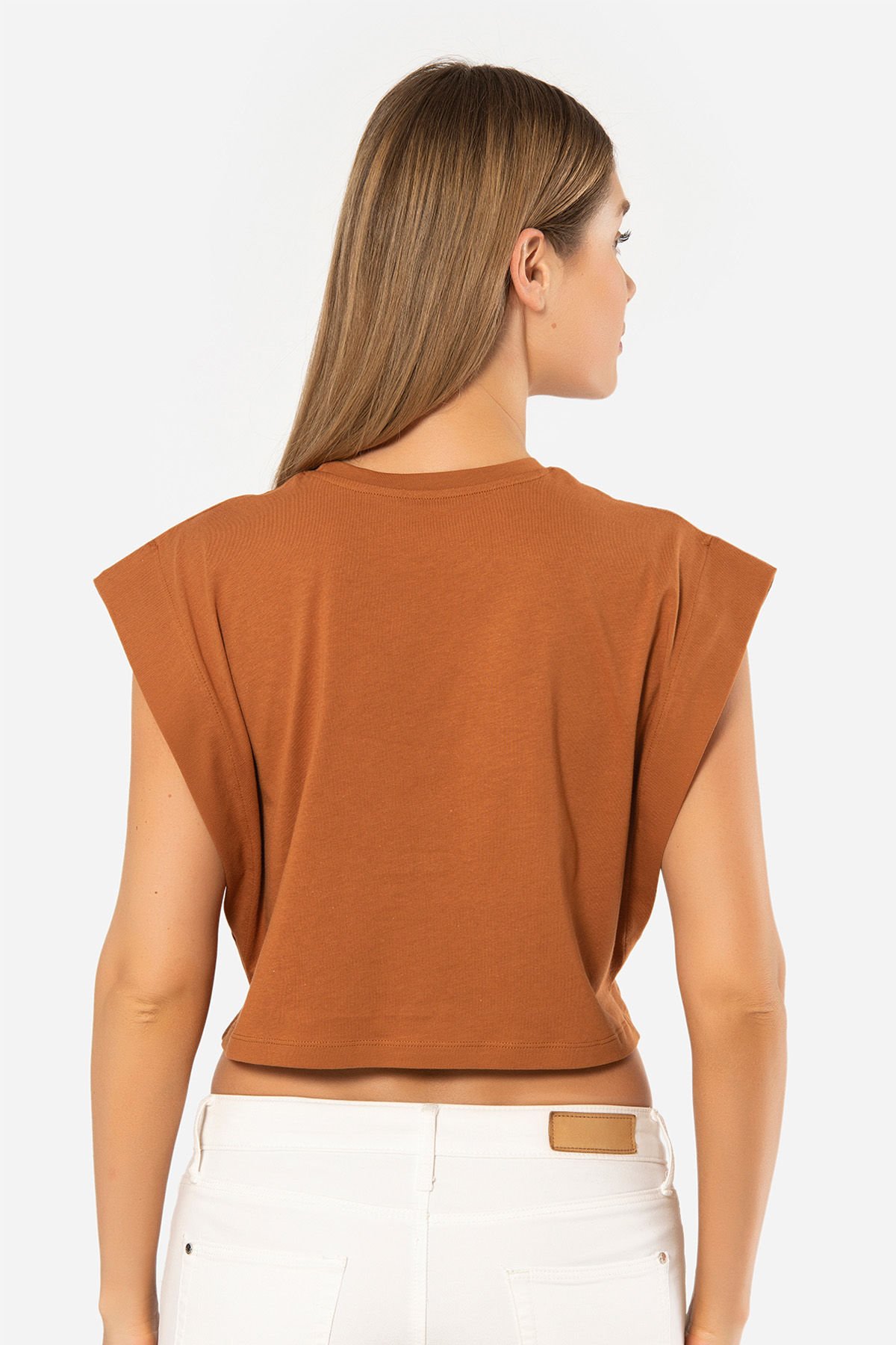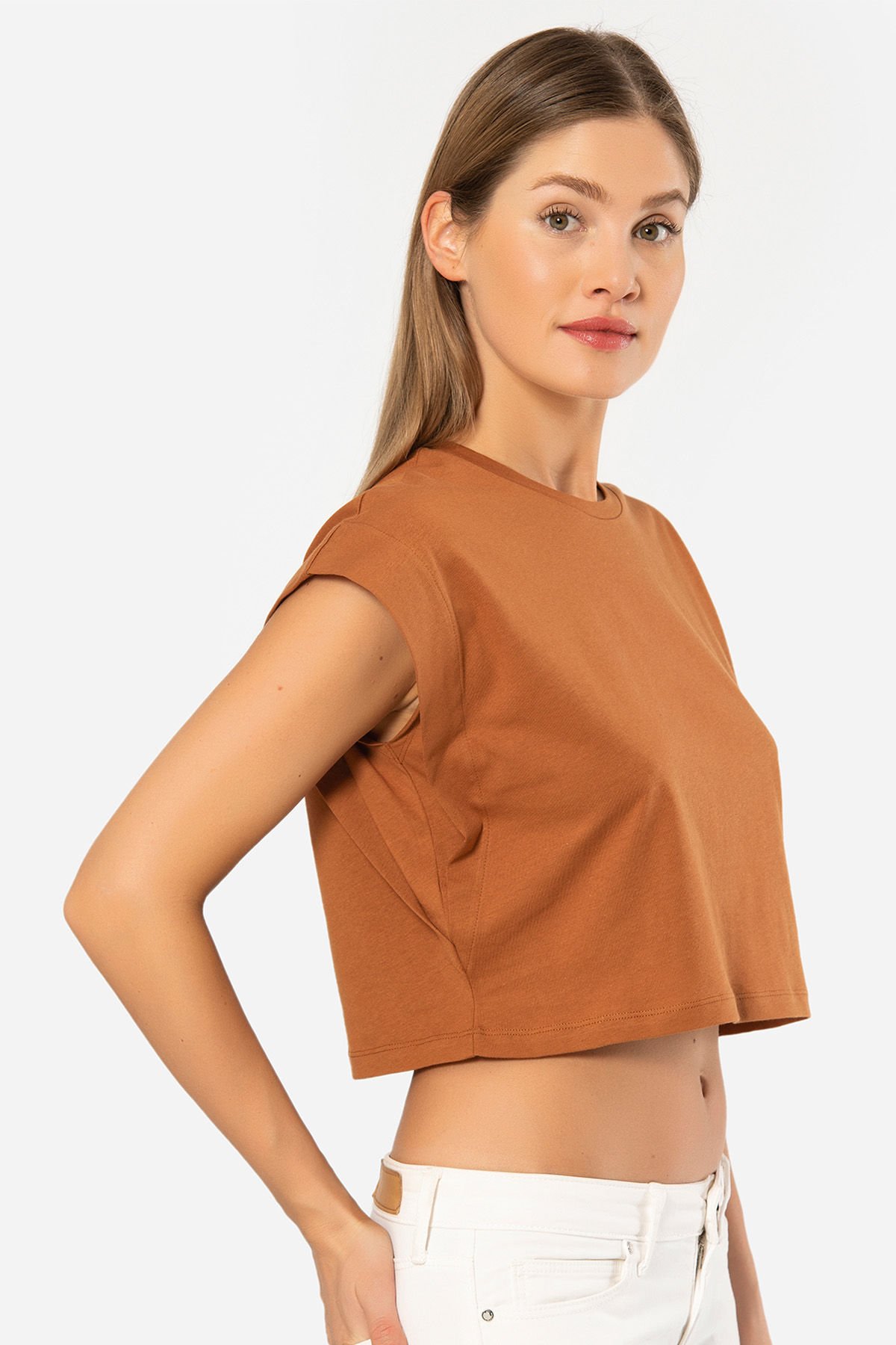 Vatka görünümlü, kol altı detaylı, bisiklet yaka crop t-shirt. Rahatlığı ve şıklığı ile günlük